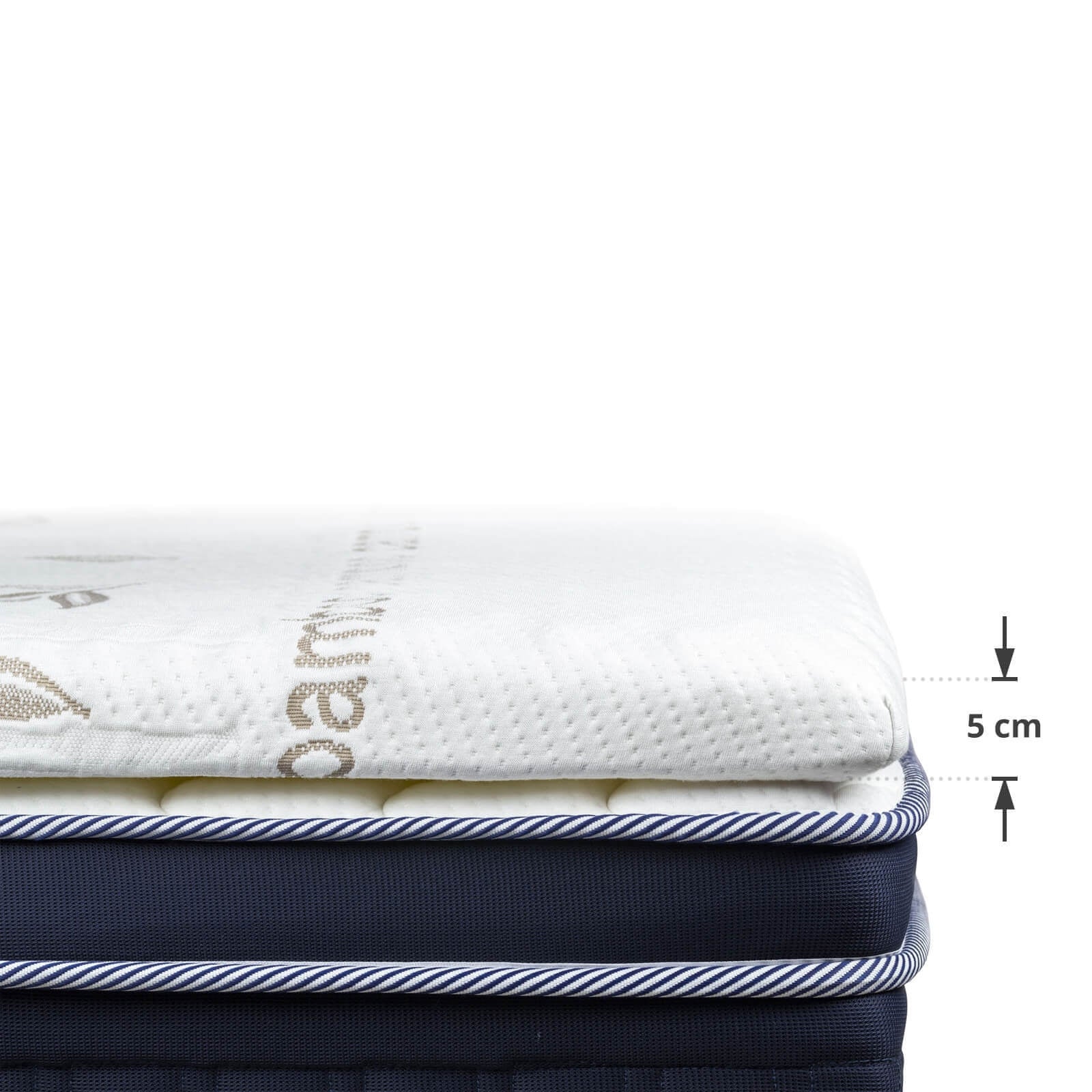 90 x 200 cm. Other dimensions also available. Height 5 cm. Foam with pyramid structure. With bamboo fibres. Cover washable at 30 °C.