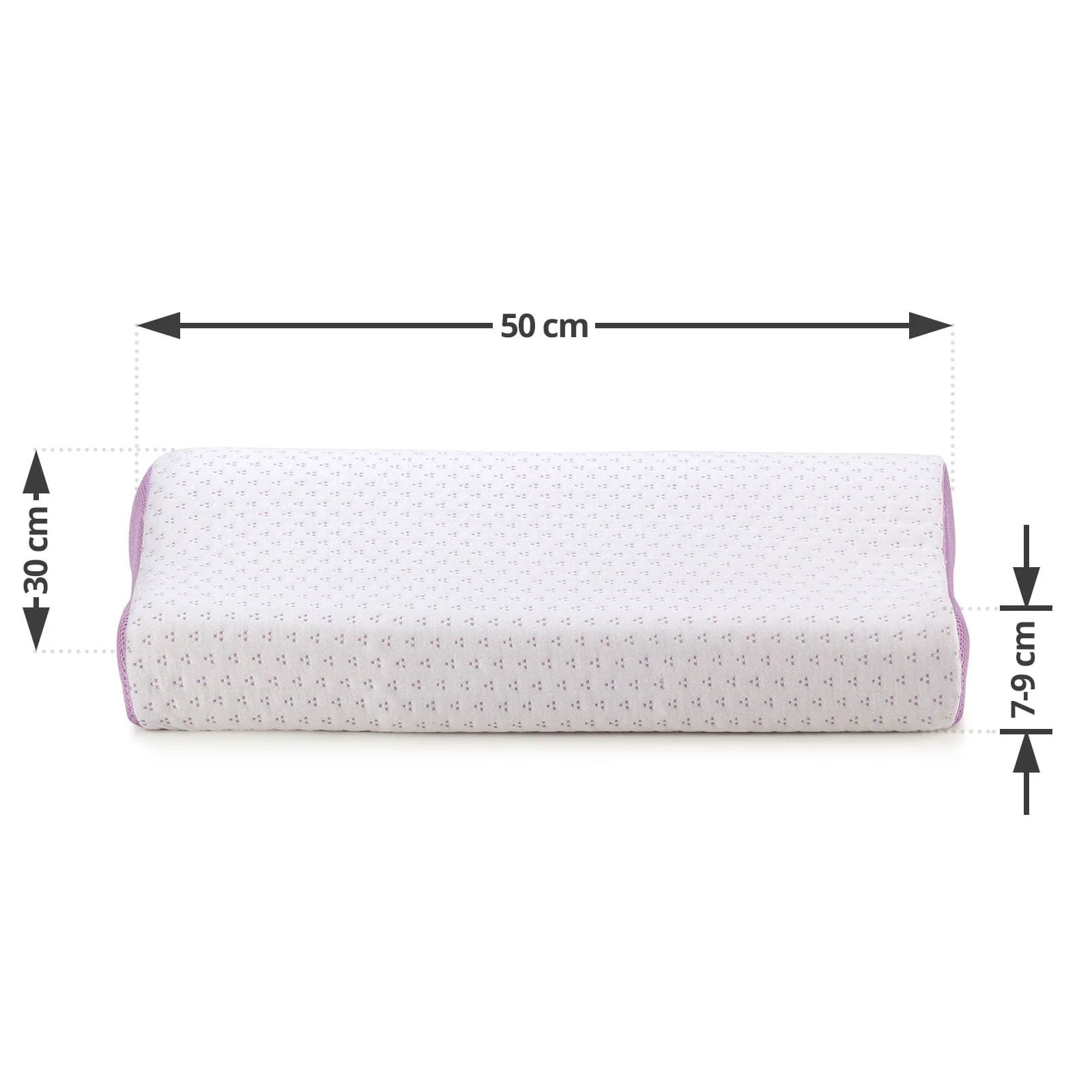 30 x 50 cm. For side and back sleeping. Core: memory foam. Microfibre and viscose cover. Pillowcase washable at 40 °C.