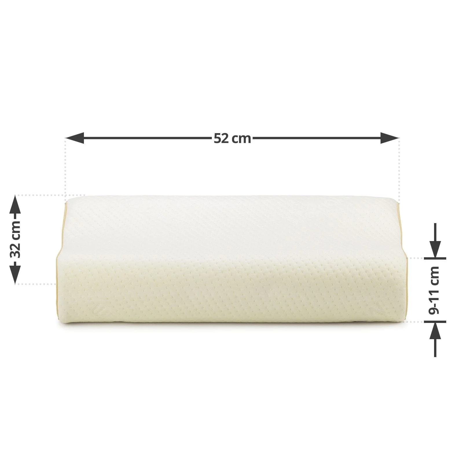 32 x 52 cm. Core: MemoTouch memory foam. Cover fabric: AirCell microfibre. Pillowcase washable at 40 °C.